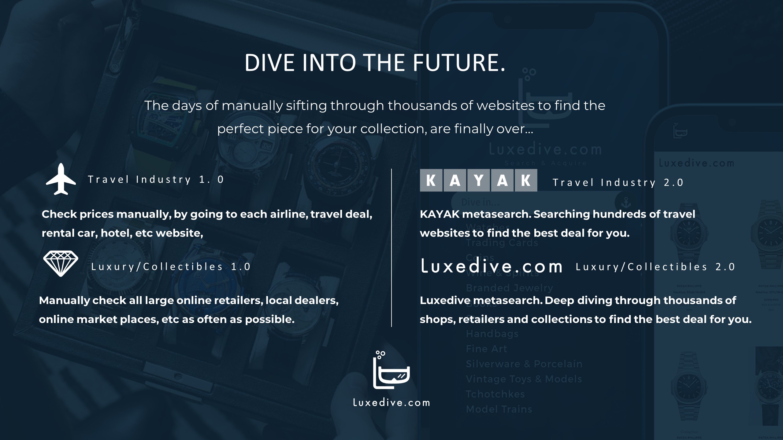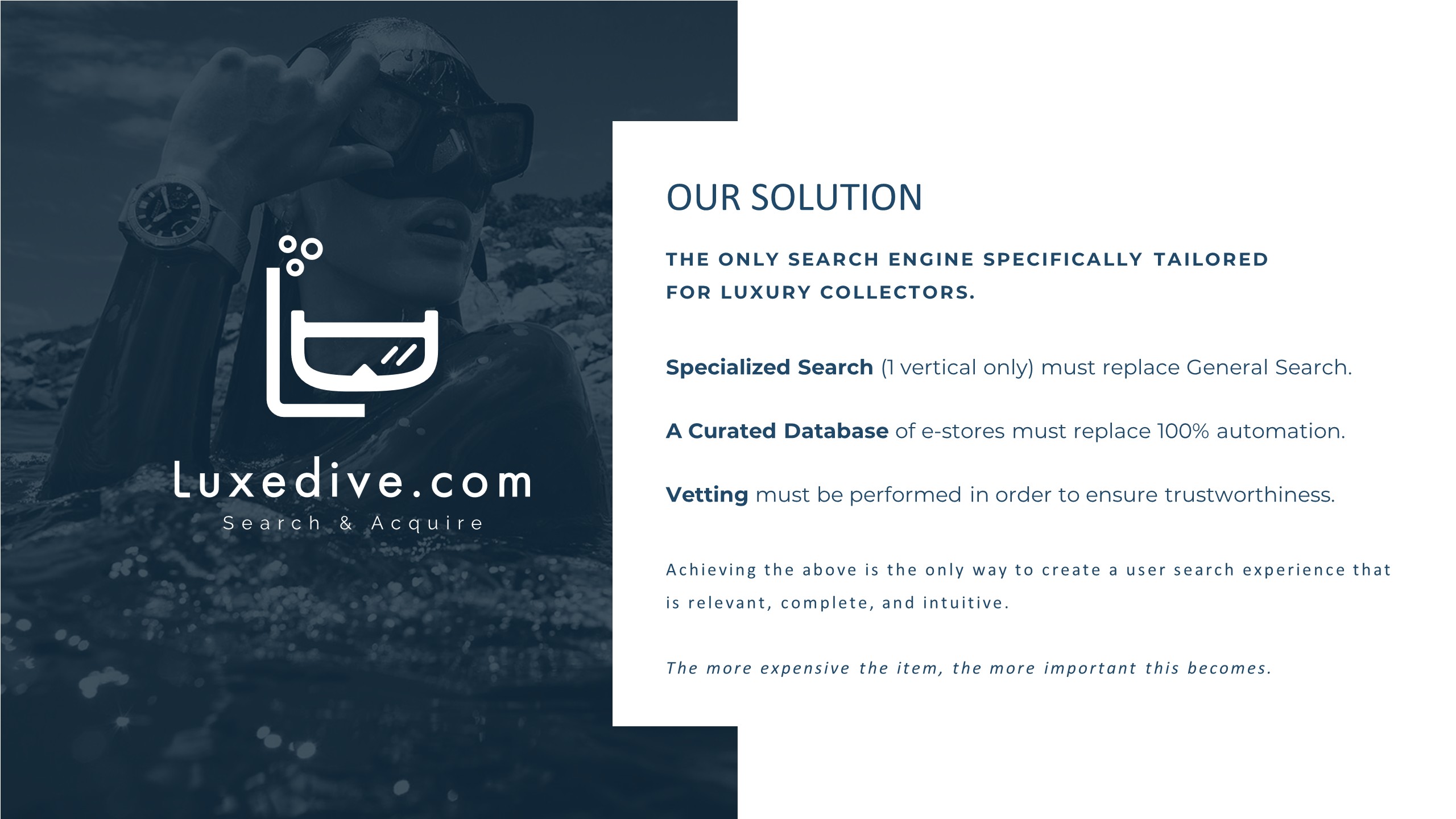 Luxedive is a luxury-focused search and discovery platform designed specifically for collectors. Built to solve the fragmentation and inefficiency of existing marketplaces, Luxedive organizes high-value product information into a single, deep-search experience tailored to the way collectors actually research, compare, and acquire rare items. The platform positions itself as a vertical alternative to general search engines, prioritizing relevance, trust, and completeness over volume.