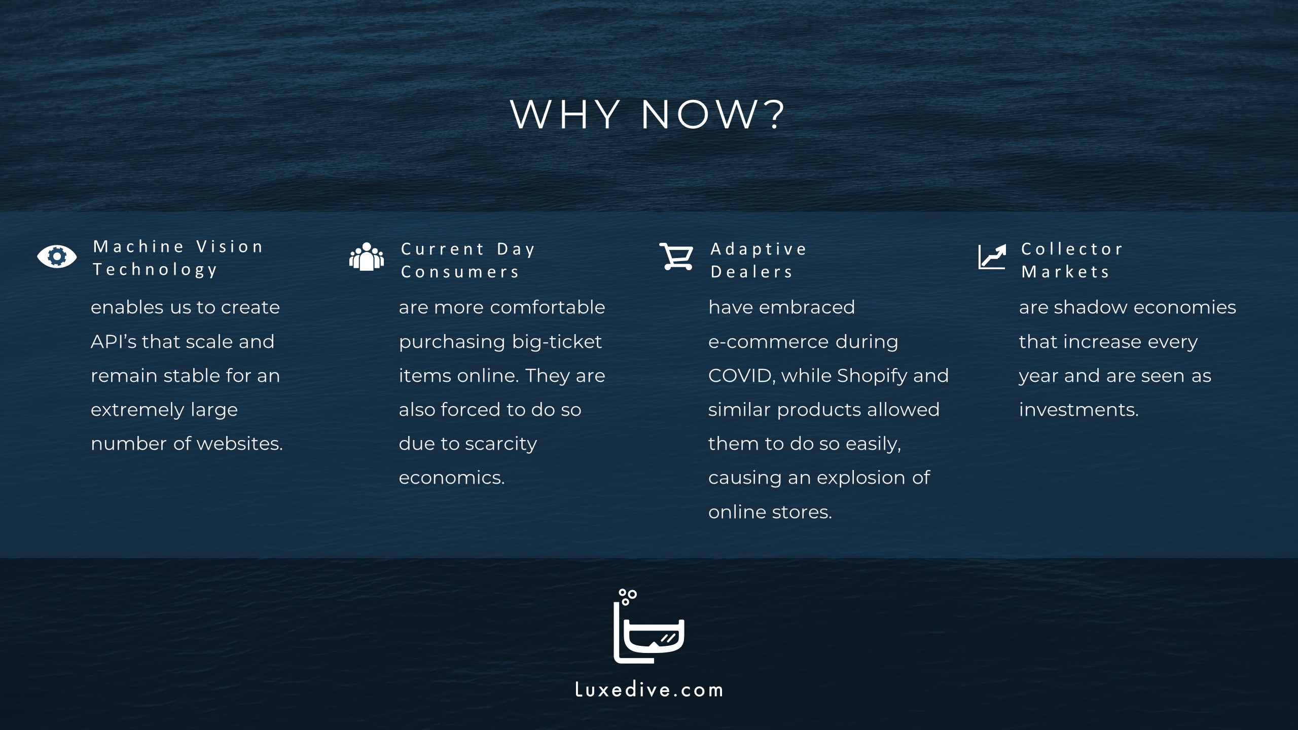 The project encompassed brand identity, motion graphics, video editing, product vision, and presentation design, establishing Luxedive as a refined, utility-driven platform within the luxury ecosystem. Inspired by the metaphor of “diving deep,” the visual system pairs restrained typography, immersive imagery, and a calm, confidence-driven interface to reinforce credibility and focus. Designed to scale across multiple luxury verticals, Luxedive reframes search as a premium experience, built for users who demand accuracy, transparency, and depth when investing in high-value goods.